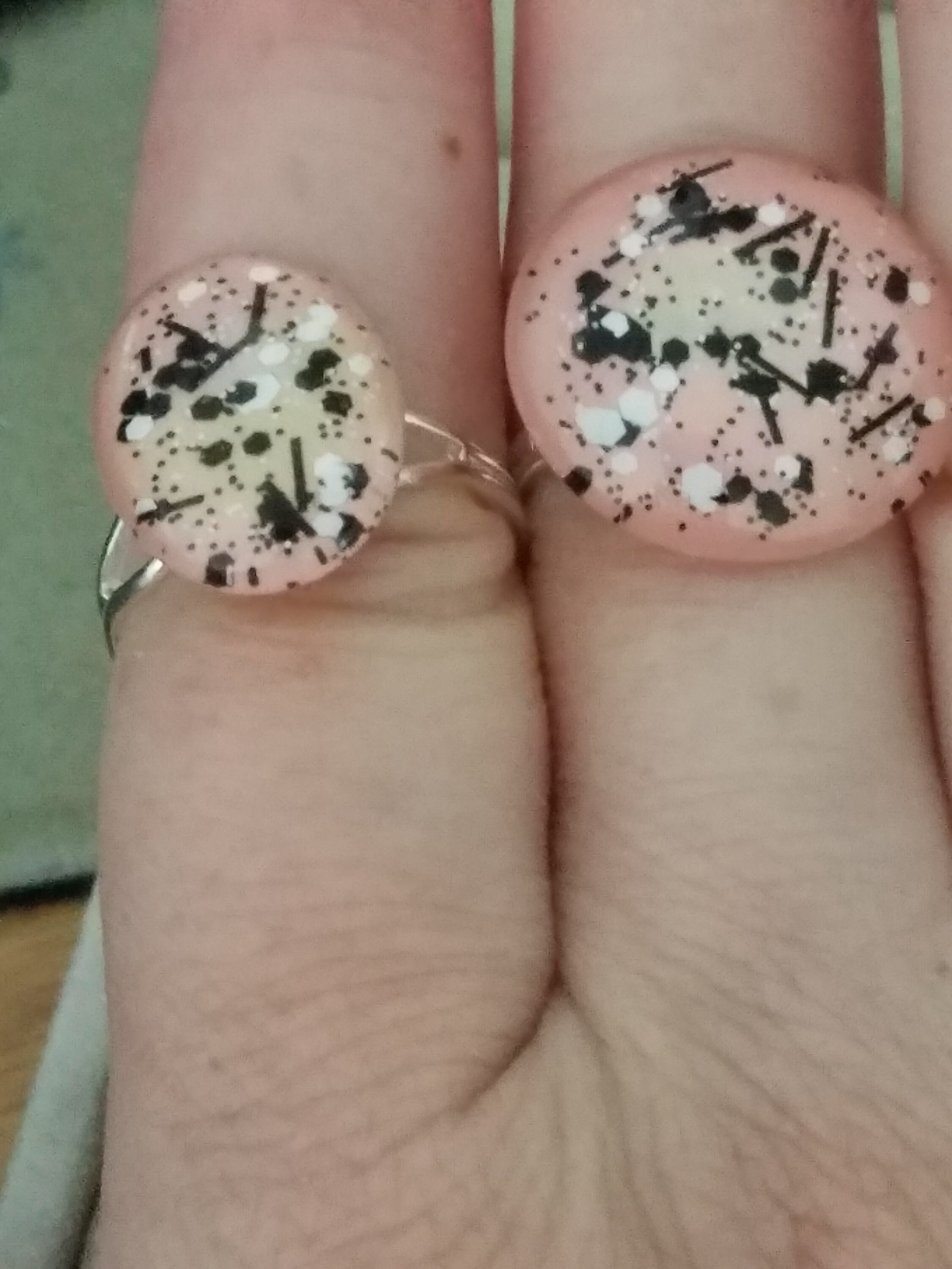 Made from hand painted glass they are hand painted and created with a black and white splatter pattern over a light pale pink seen in the pictures above.